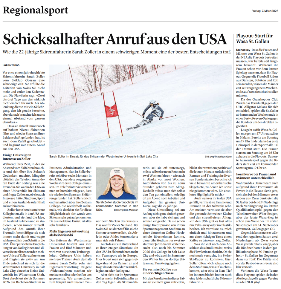 Als ich im Frühling die Kriterien für das Swissski-Kader nicht erfüllt habe und dadurch den Kaderstatus verlor, habe ich mir überlegt, wie meine sportliche Zukunft aussehen soll. Innerhalb von zwei Wochen nach der Selektion erhielt ich Nachrichten von verschiedenen Universitäten in den USA und führte anschliessend Gespräche mit den Coaches über ihre Programme. Die Möglichkeit, weiterhin Ski zu fahren und gleichzeitig vor Ort zu studieren, hat mich direkt angesprochen. Zusätzlich wollte ich unbedingt die Erfahrung machen, einmal im Ausland zu leben und mein Englisch verbessern. Schliesslich entschied ich mich für die Westminster University in Salt Lake City, Utah. Der Aufnahmeprozess war zwar kompliziert, doch ich bin nun seit 2 Monaten hier und es hat sich definitiv gelohnt.